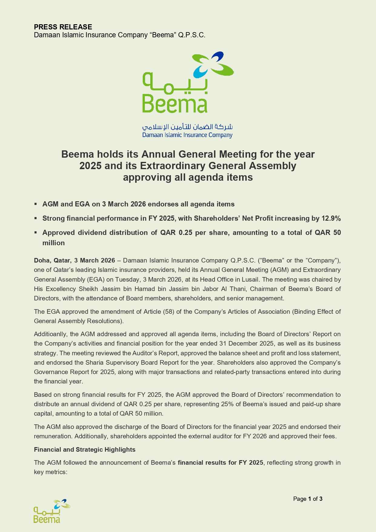 Beema holds its Annual General Meeting for the year 2025 and its Extraordinary General Assembly approving all agenda items
