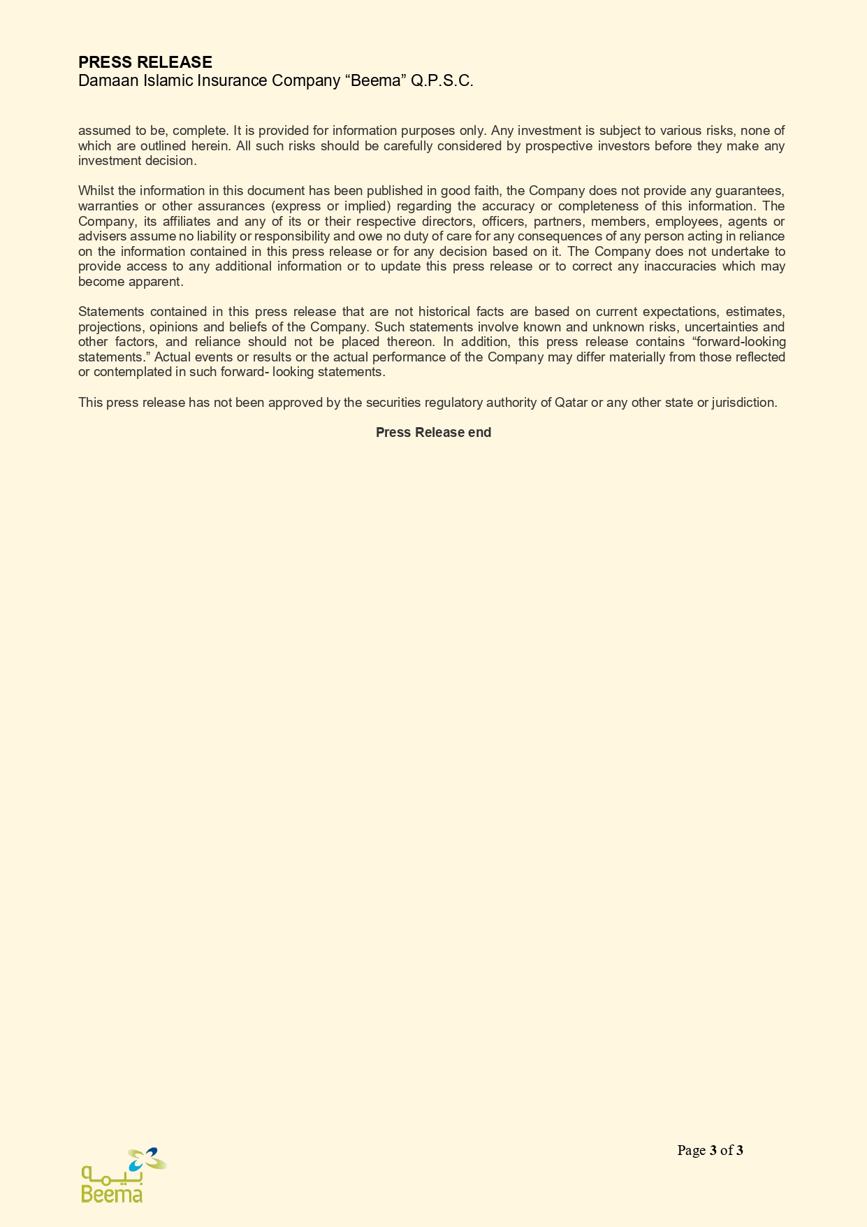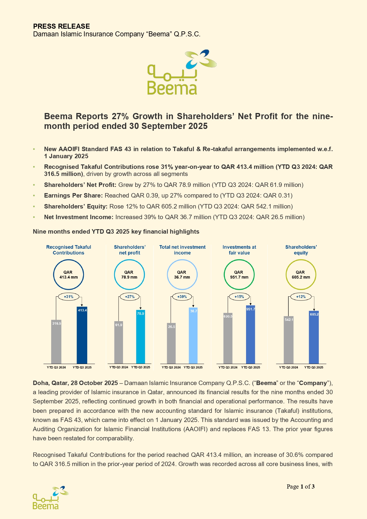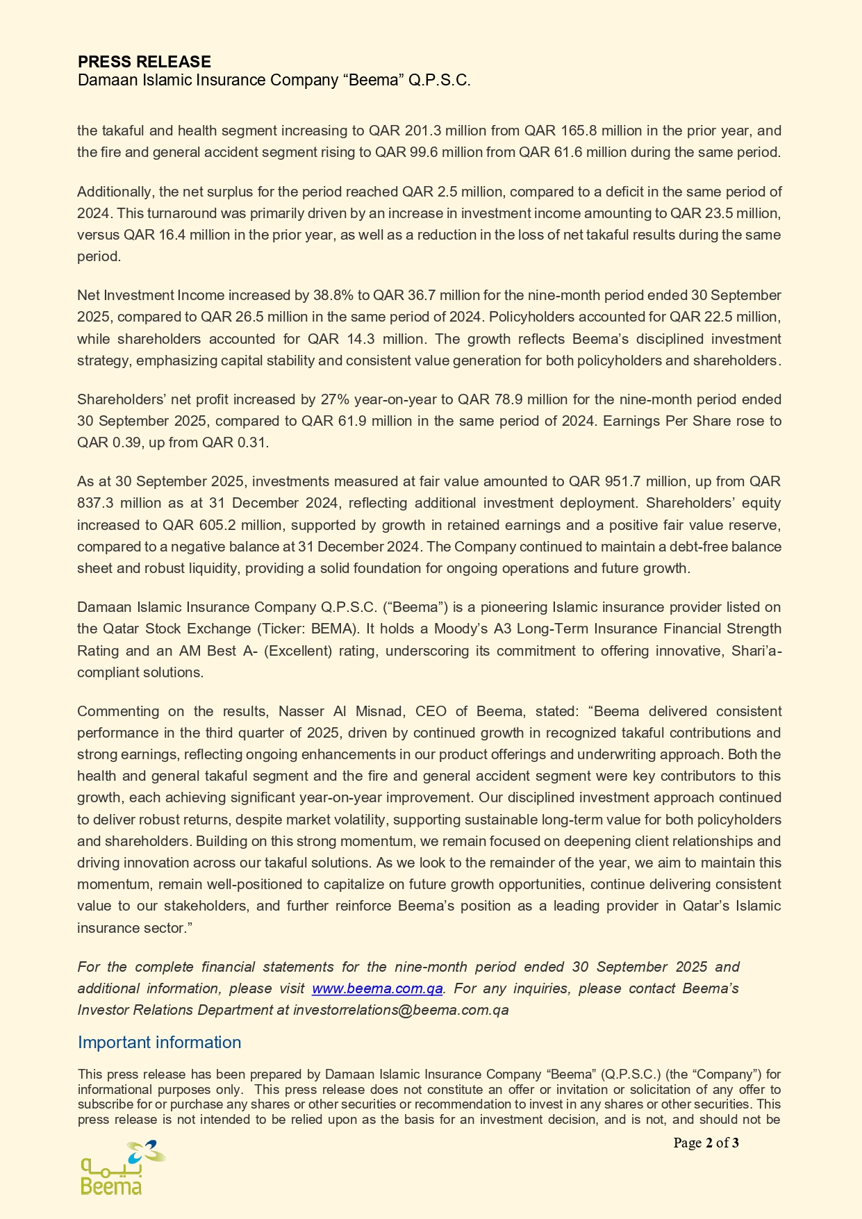 Beema Reports 27% Growth in Shareholders’ Net Profit for the nine-month period ended 30 September 2025